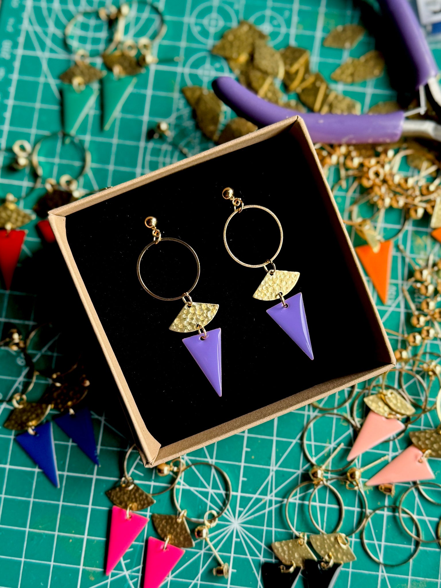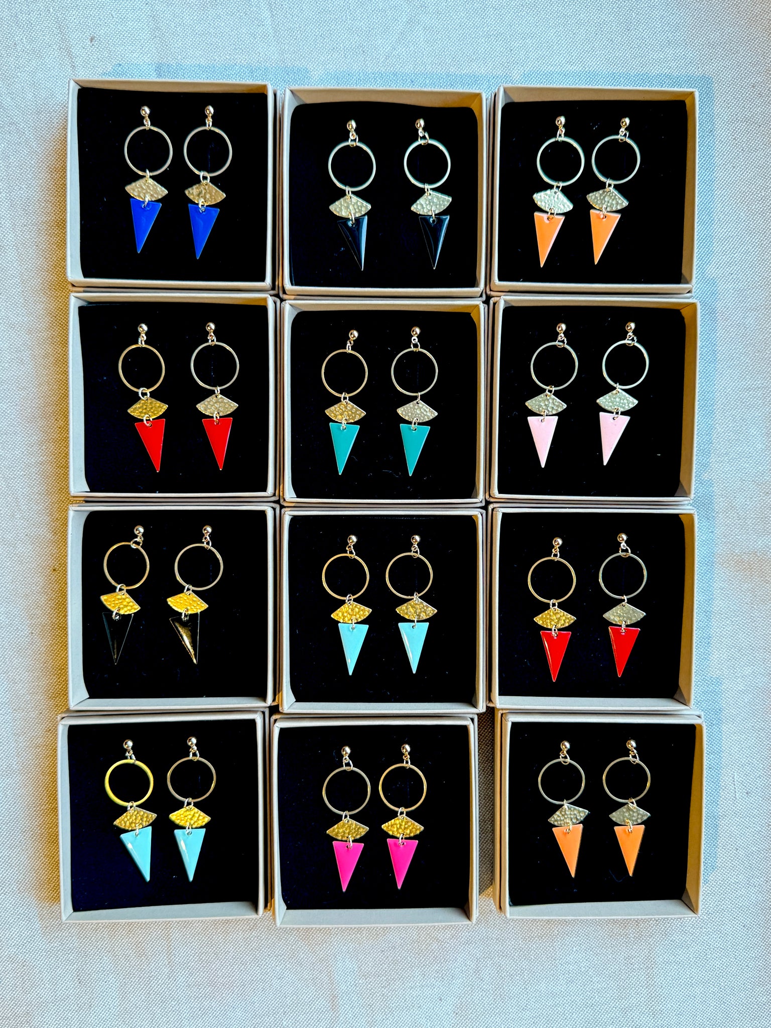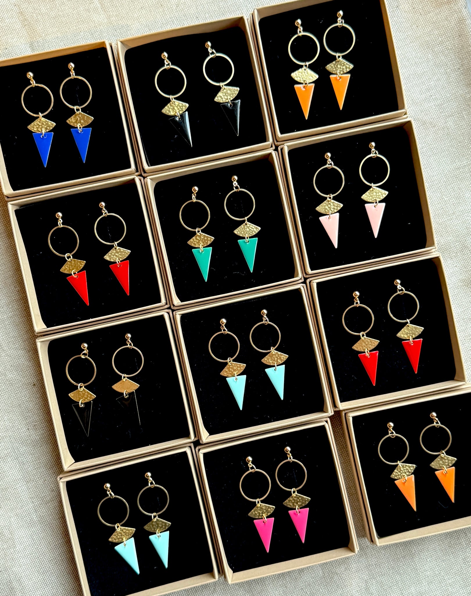 Each pair features 18k gold-plated ball studs with an embossed fan charm, a circular accent, and a colourful enamelled triangle that adds a playful geometric finish. Handcrafted with care, they’re lightweight, eye-catching, and designed to bring a touch of golden energy to any look.