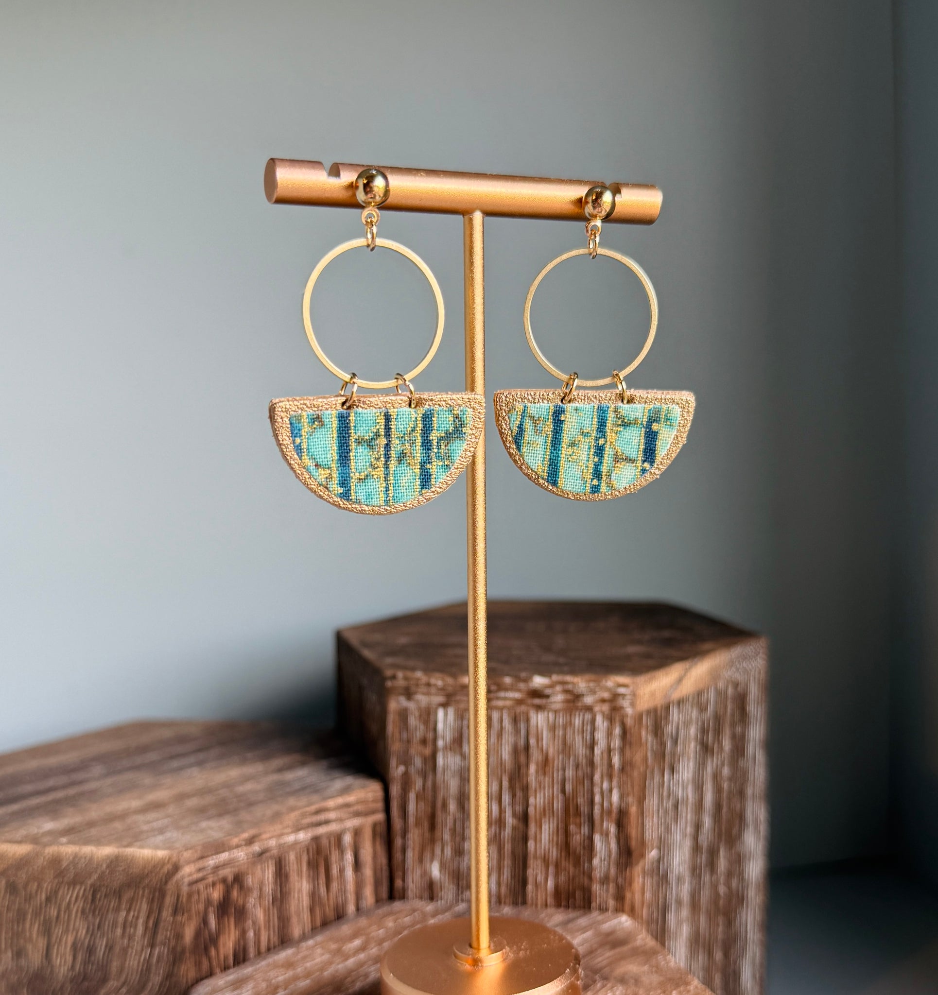 These beautiful earrings are handmade using a mix of genuine leather off-cuts and green & gold embossed fabric.
